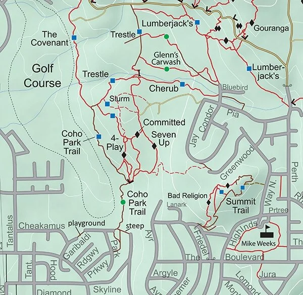 Coho Trail leads north and up the escarpment to link with the many trails of Garibaldi Highlands and Alice Lake. The steep trail leading east and up to Ayr Drive will also link to the highlands trails. Venturing up Coho and down 4 Play will provide a fine 1.8-kilometre loop. A good hour of jogging will get you to Alice Lake and back. Trail runners enjoy the area, and climbers are attracted to some of the boulders along the escarpment.