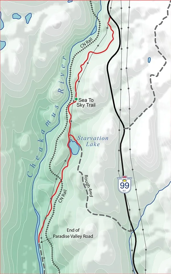 This long-range trail is coordinated by the Squamish-Lillooet Regional District on behalf of the municipalities and First Nations along the route. The leg of this trail south from Brandywine Park is very picturesque and travels through open second-growth forest by Reita Lake and the Black Tusk subdivision. From the Chance Creek Bridge, the trail follows the edge of Highway 99 until the Tantalus viewpoint, where there are picnic tables. Here, the trail drops off the west side of the highway toward Paradise Valley. This pea gravel section is steep at times and may be blocked by erosion and landslides. You will come to the unofficial railway crossing near the Cheakamus River and then follow the riverbank and rail line to the end of Paradise Valley Road. It is definitely “use at your own risk” along the railway right of way.